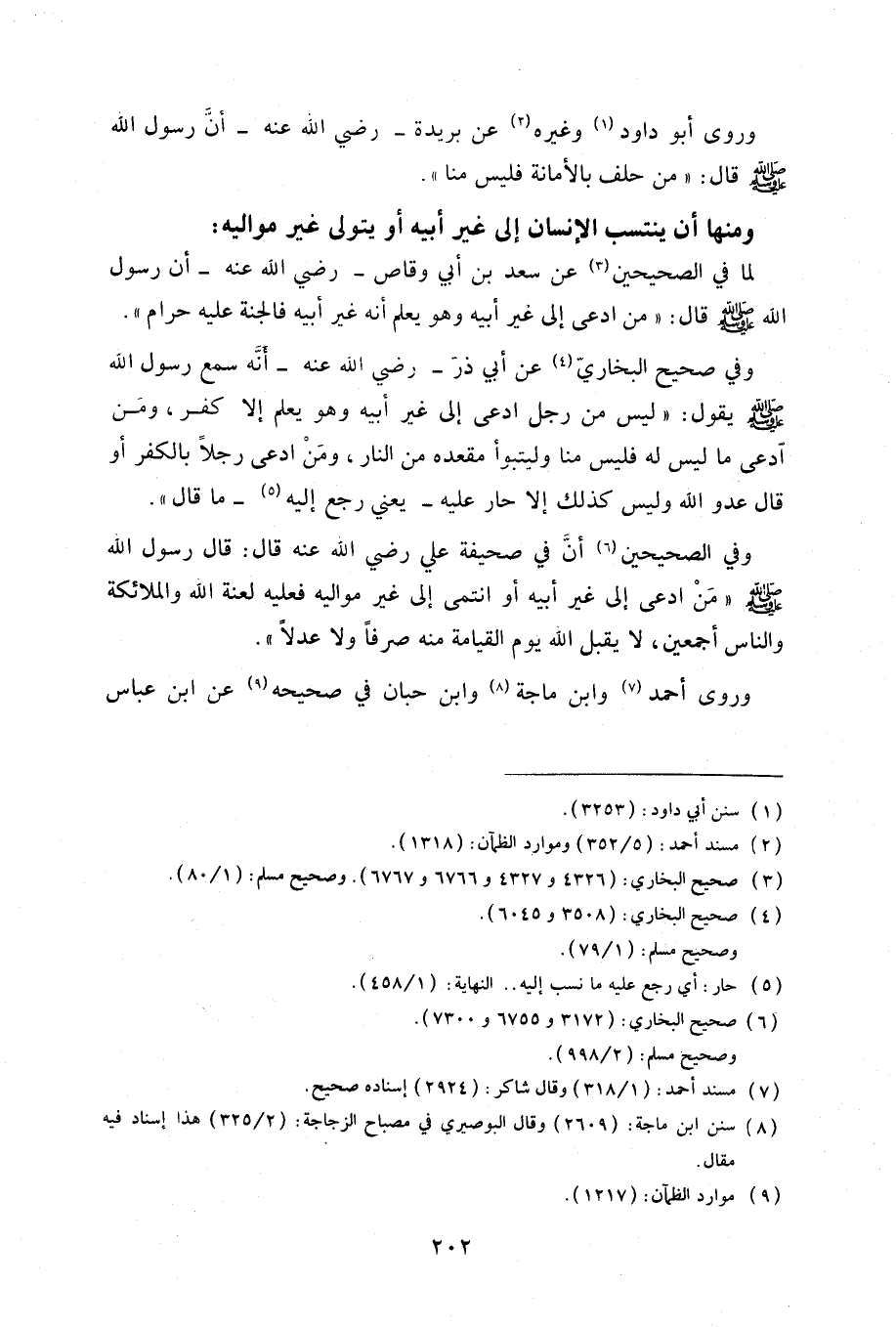 في الصحيحين أن في صحيفة علي رضي الله عنه قال: قال رسول الله (صلى الله عليه وسلم) قال: «من ادعى إلى غير أبيه أو انتمى إلى غير مواليه فعليه لعنة الله والملائكة والناس أجمعين، لا يقبل الله يوم القيامة منه صرفاً ولا عدلاً».