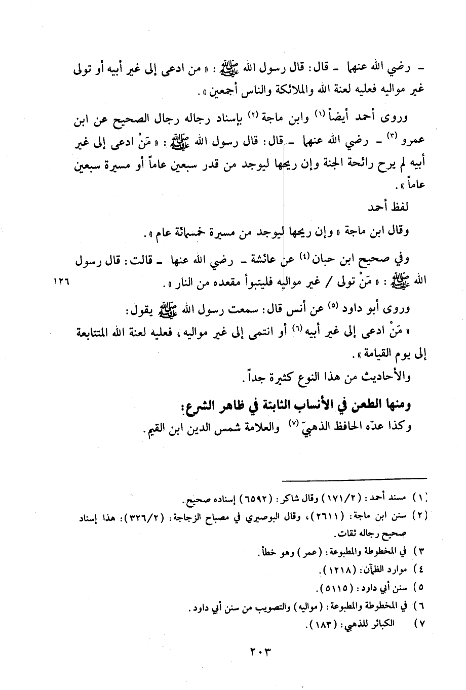 وروى أحمد أيضاً وابن ماجة بإسناد رجاله رجال الصحيح عن ابن عمرو -رضي الله عنهما- قال: قال رسول الله (صلى الله عليه وسلم): «من ادعى إلى غير أبيه لم يرح رائحة الجنة وإن ريحها ليوجد من قدر سبعين عاماً أو مسيرة سبعين عاماً».