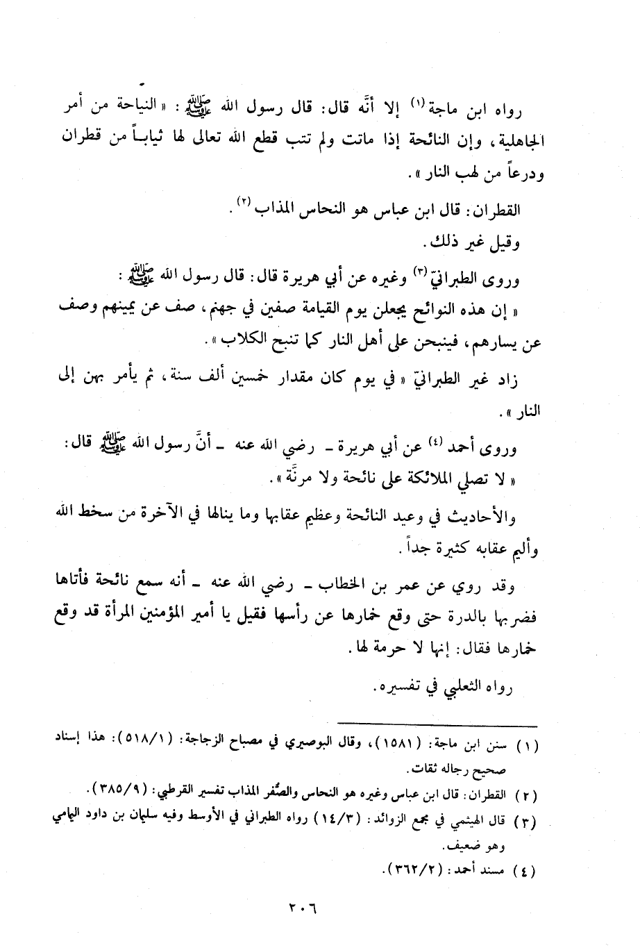 «إن هذه النوائح يجعلن يوم القيامة صفين في جهنم، صف عن يمينهم وصف عن يسارهم، فينبحن على أهل النار كما تنبح الكلاب».