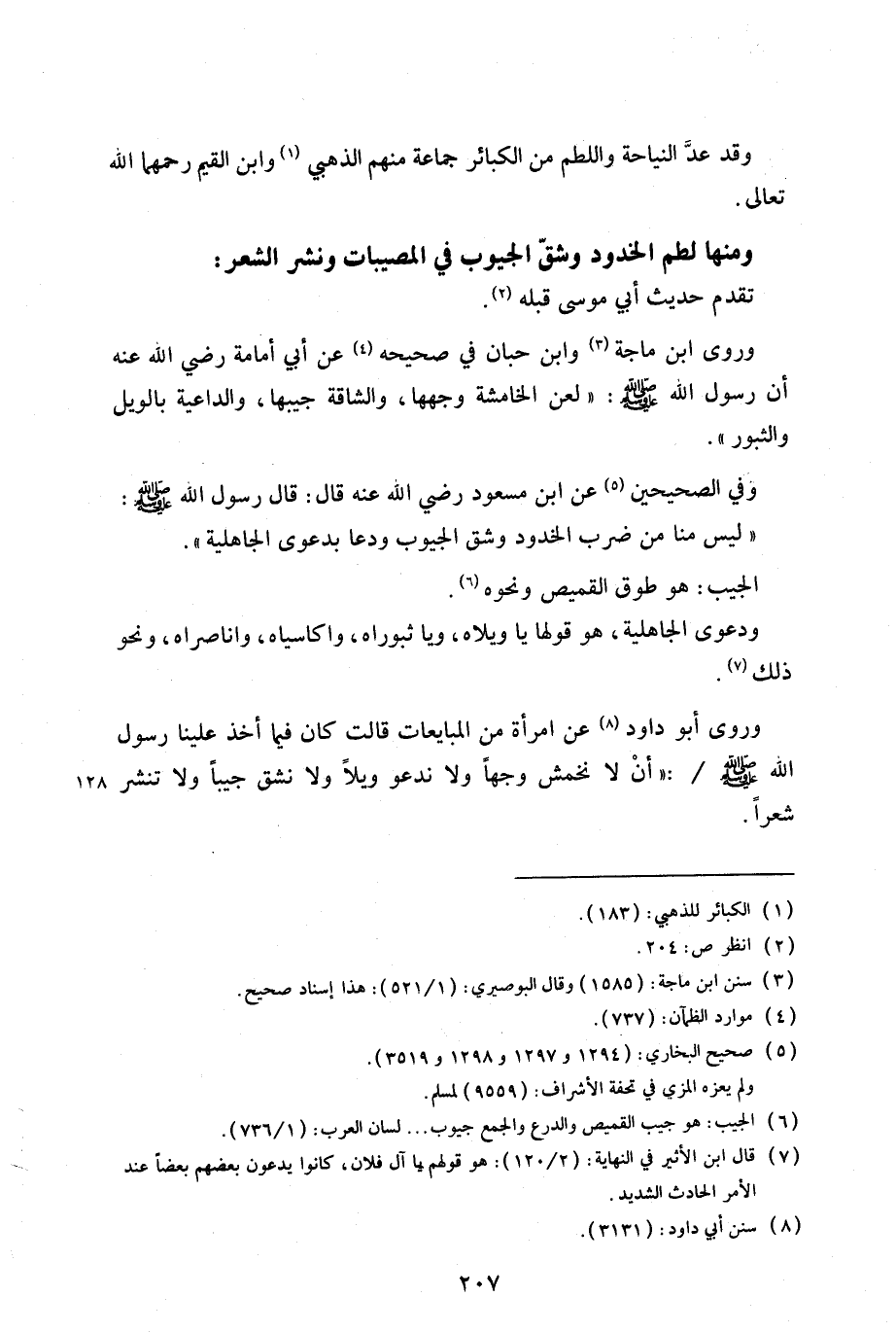 وفي الصحيحين عن ابن مسعود رضي الله عنه قال: قال رسول الله (صلى الله عليه وسلم): «ليس منا من ضرب الخدود وشق الجيوب ودعا بدعوى الجاهلية».