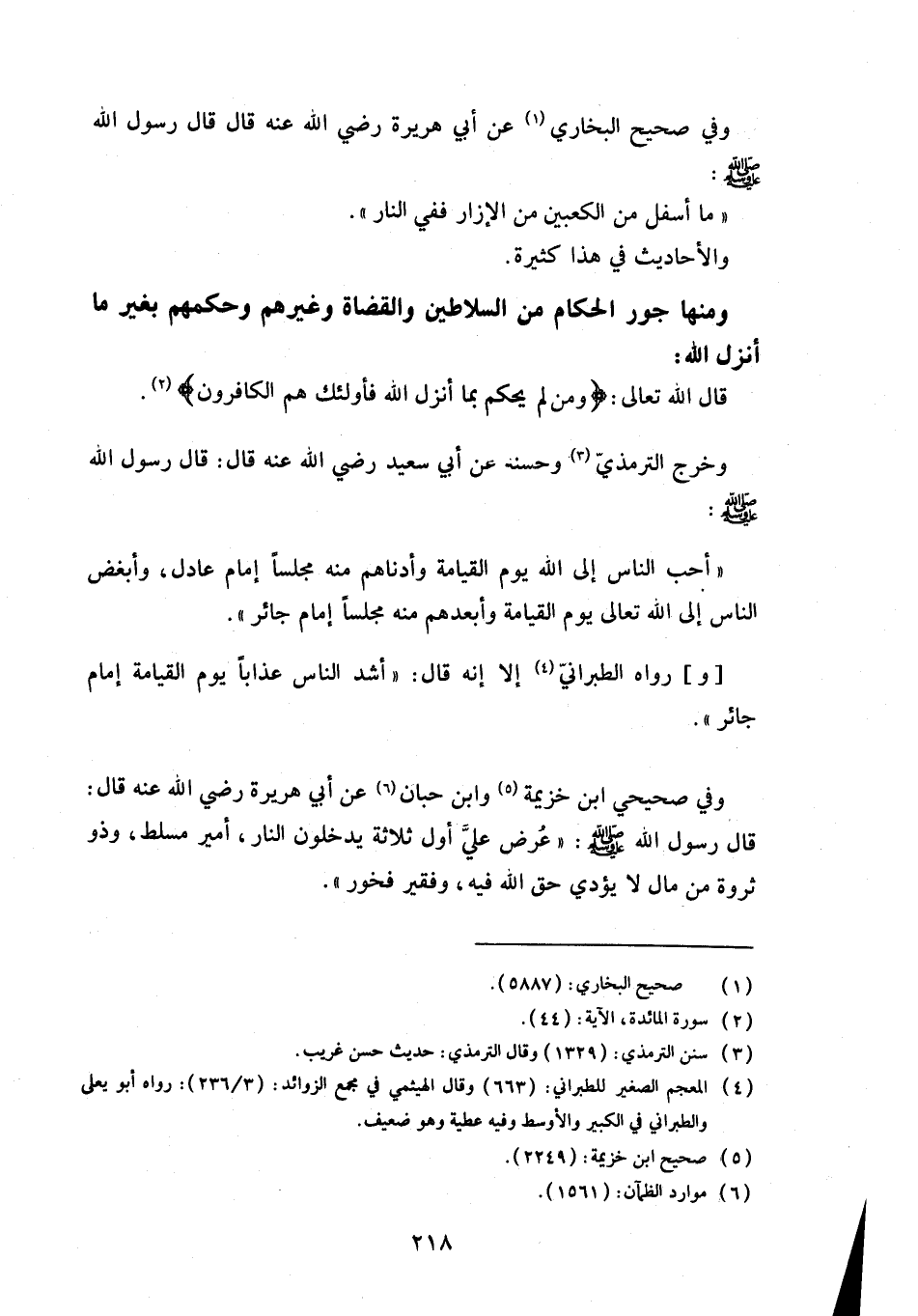 وفي الصحيحين ابن خزيمة وابن حبان عن أبي هريرة رضي الله عنه قال: قال رسول الله (صلى الله عليه وسلم): «عُرض عليَّ أول ثلاثة يدخلون النار، أمير مسلط، وذو ثروة من مال لا يؤدي حق الله فيه، وفقير فخور».