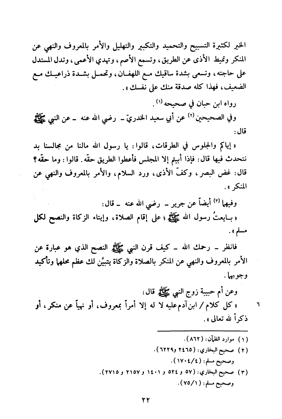«إياكم والجلوس في الطرقات، قالوا: يا رسول الله مالنا من مجالسنا بد نتحدث فيها قال: فإذا أبيتم إلا المجلس فأعطوا الطريق حقه. قالوا: وما حقه؟ قال: غض البصر، وكف الأذى، ورد السلام، والأمر بالمعروف والنهي عن المنكر».