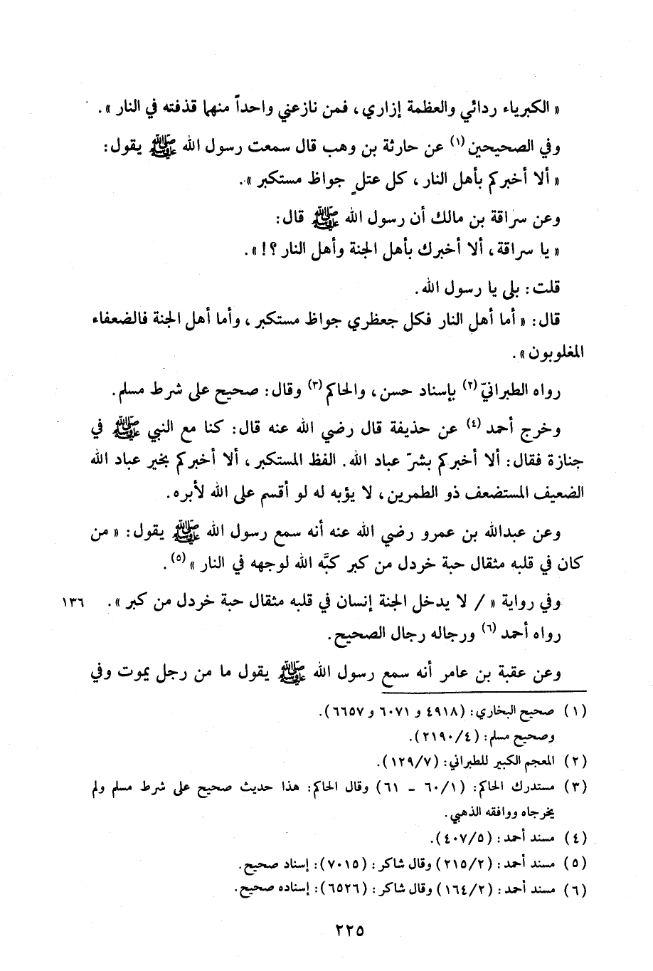 وعن عبد الله بن عمرو رضي الله عنه أنه سمع رسول الله (صلى الله عليه وسلم) يقول: «من كان في قلبه مثقال حبة خردل من كبر كبَّه الله لوجهه في النار».
