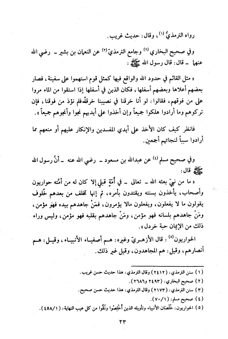«ما من نبي بعثه الله – تعالى – في أمة قبلي إلا كان له من أمته حواريون وأصحاب، يأخذون بسنته ويقتدون بأمره، ثم إنها تخلف من بعدهم خلوف يقولون ما لا يفعلون، ويفعلون ما لا يؤمرون، فمن جاهدهم بيده فهو مؤمن، ومن جاهدهم بيده فهو مؤمن، ومن جاهدهم بلسانه فهو مؤمن، ومن جاهدهم بقلبخ فهو مؤمن، وليس وراء ذلك من الإيمان حبة خردل».
