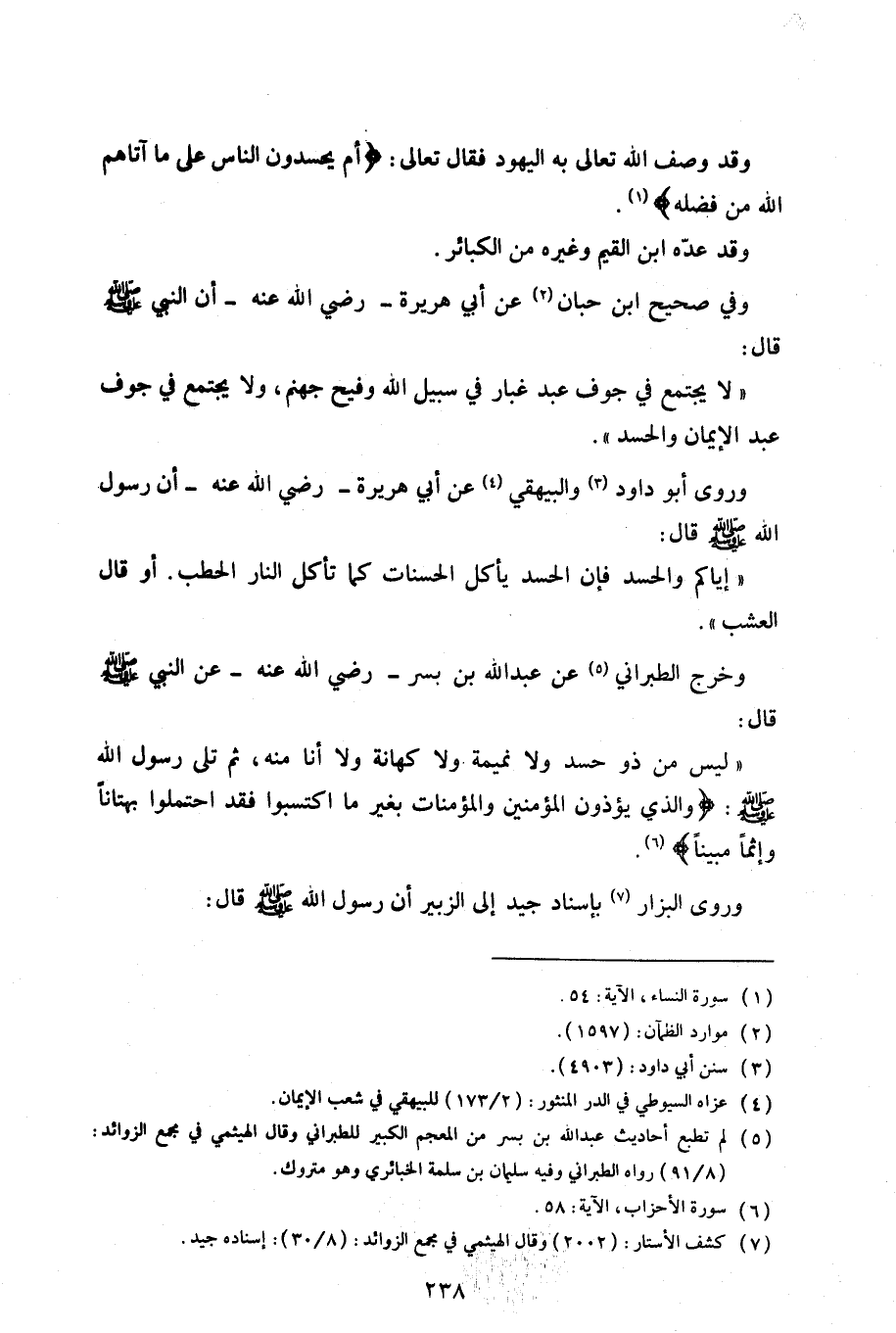 «لا يجتمع في جوف عبد غبار في سبيل الله وفيح جهنم، ولا يجتمع في جوف عبد الإيمان والحسد».