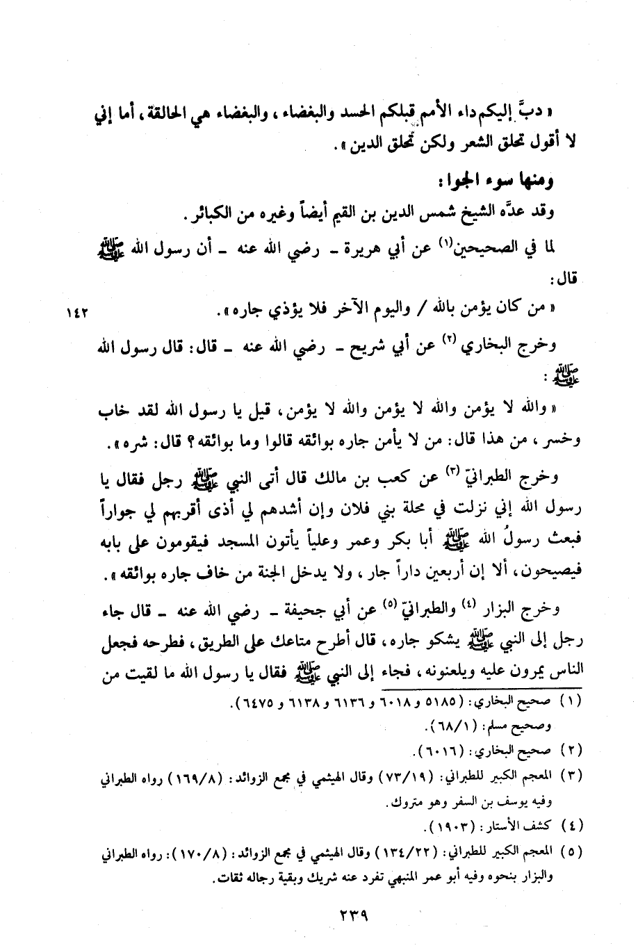 «والله لا يؤمن والله لا يؤمن والله لا يؤمن، قيل يا رسول الله لقد خاب وخسر، من هذا قال: من لا يأمن جاره بوائقه قالوا وما بوائقه؟ قال: شره».