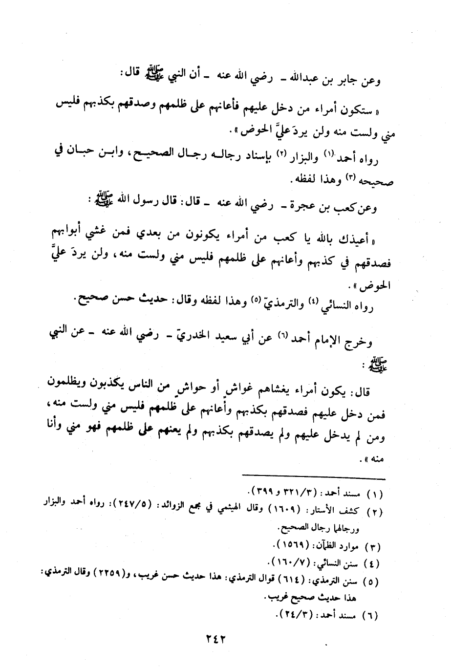 «أعيذك بالله يا كعب من أمراء يكونون من بعدي فمن غشي أبوابهم فصدقهم في كذبهم وأعانهم على ظلمهم فليس مني ولست منه، ولن يرد على الحوض».