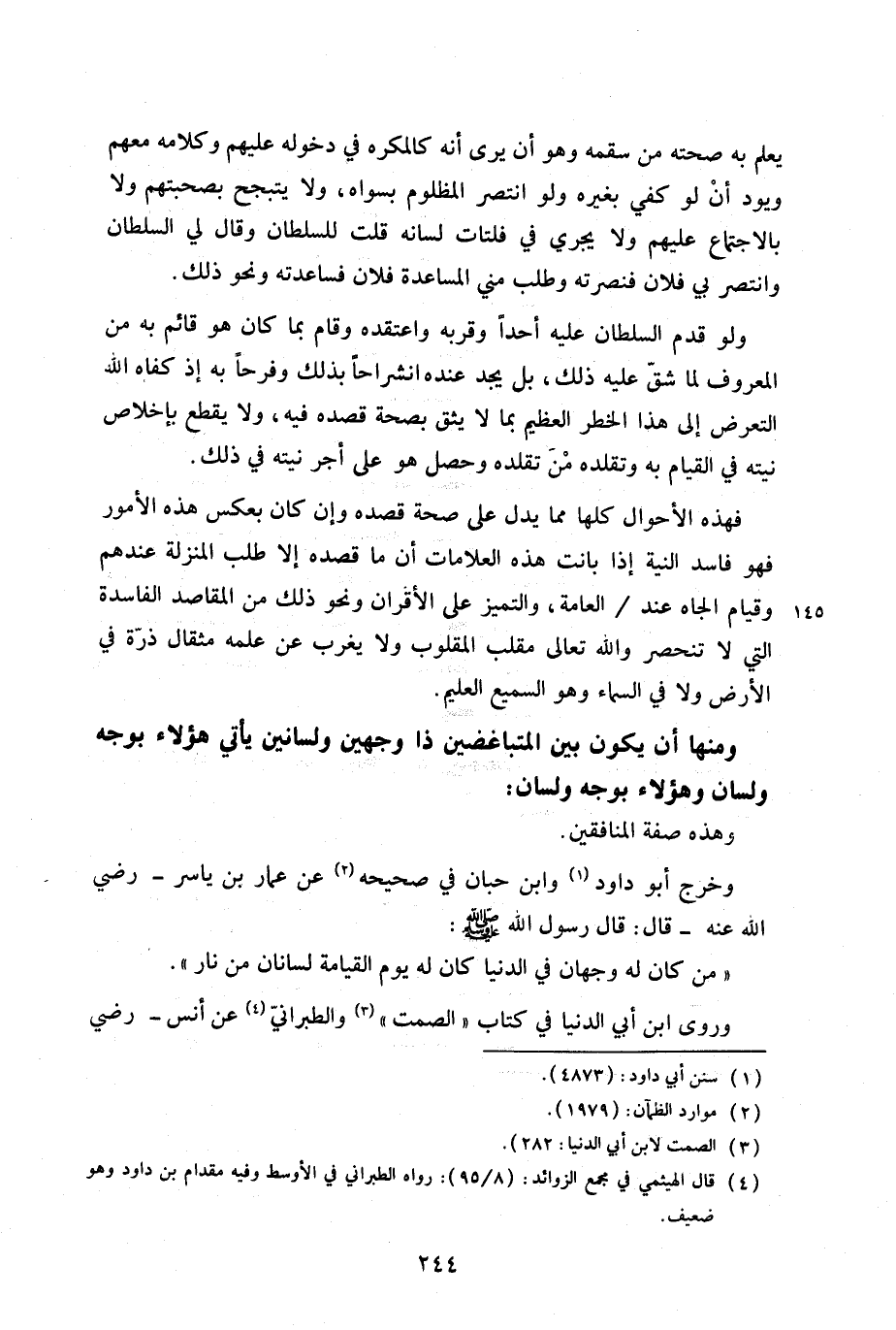 ومنها أن يكون بين المتباغضين ذا وجهين ولسانين يأتي هؤلاء بوجه ولسان وهؤلاء بوجه ولسان: