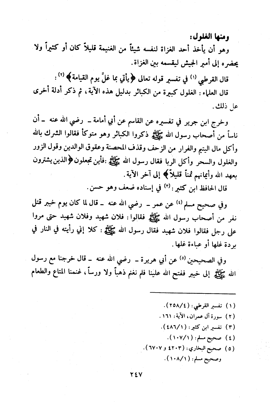 وفي صحيح مسلم عن عمر – رضي الله عنه – قال لما كان يوم خيبر قتل نفر من أصحاب رسول الله صلى الله عليه سلم فقالوا: فلان شهيد وفلان شهيد حتى مروا على رجل فقالوا فلان شهيد فقال رسول الله صلى الله عليه سلم: كلا إني رأيته في النار في بردة غلها أو عباءة غلها.