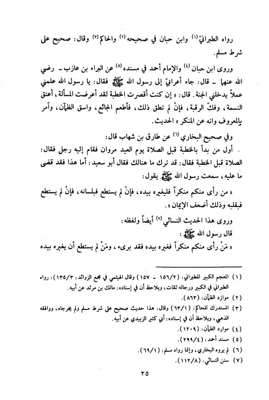 «من رأى منكم منكراً فليغيره بيده، فإن لم يستطع فبلسانه، فإن لم يستطع فبقلبه وذلك أضعف الإيمان».