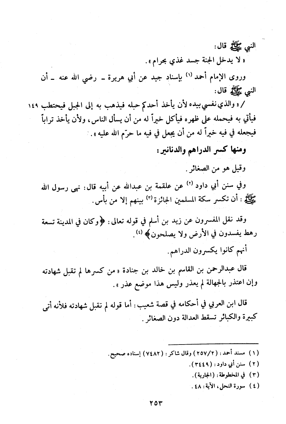 وروى الإمام أحمد بإسناد جيد عن أبي هريرة – رضي الله عنه – أن النبي صلى الله عليه وسلم قال: «والذي نفسي بيده لأن يأخذ أحدكم حبله فيذهب به إلى الجبل فيحتطب فيأتي به فيحمله على ظهره فيأكل خيراً له من أن يسأل الناس، ولأن يأخذ تراباً فيجعله في فيه خيراً له من أن يجعل في فيه ما حرم الله عليه».