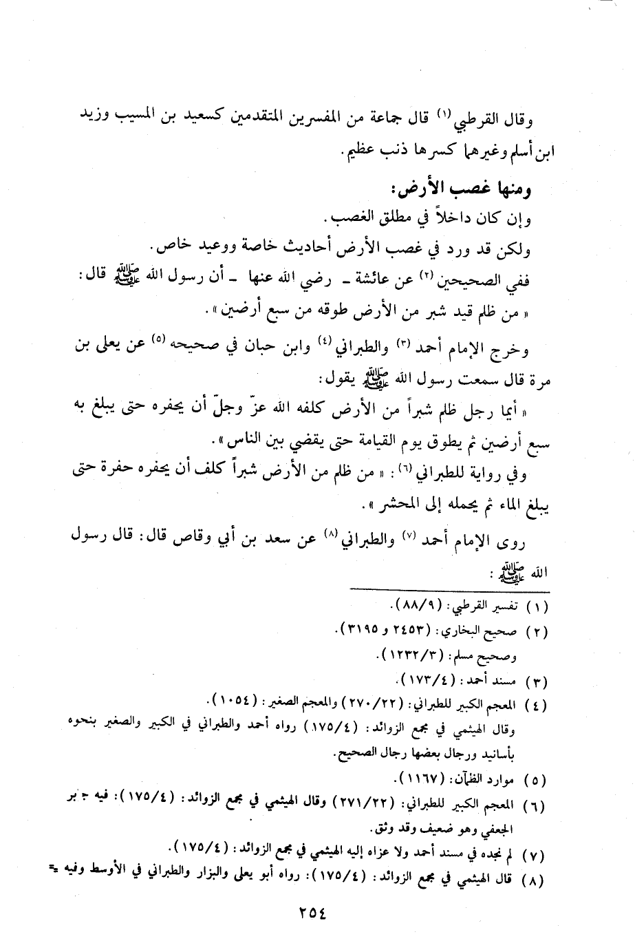 ومنها غضب الأرض: وإن كان داخلاً في مطلق الغصب. ولكن قد ورد في غصب الأرض أحاديث خاصة ووعيد خاص. ففي الصحيحين عن عائشة – رضي الله عنها – أن رسول الله صلى الله عليه وسلم قال: «من ظلم قيد شبر من الأرض طوقه من سبع أرضين».
