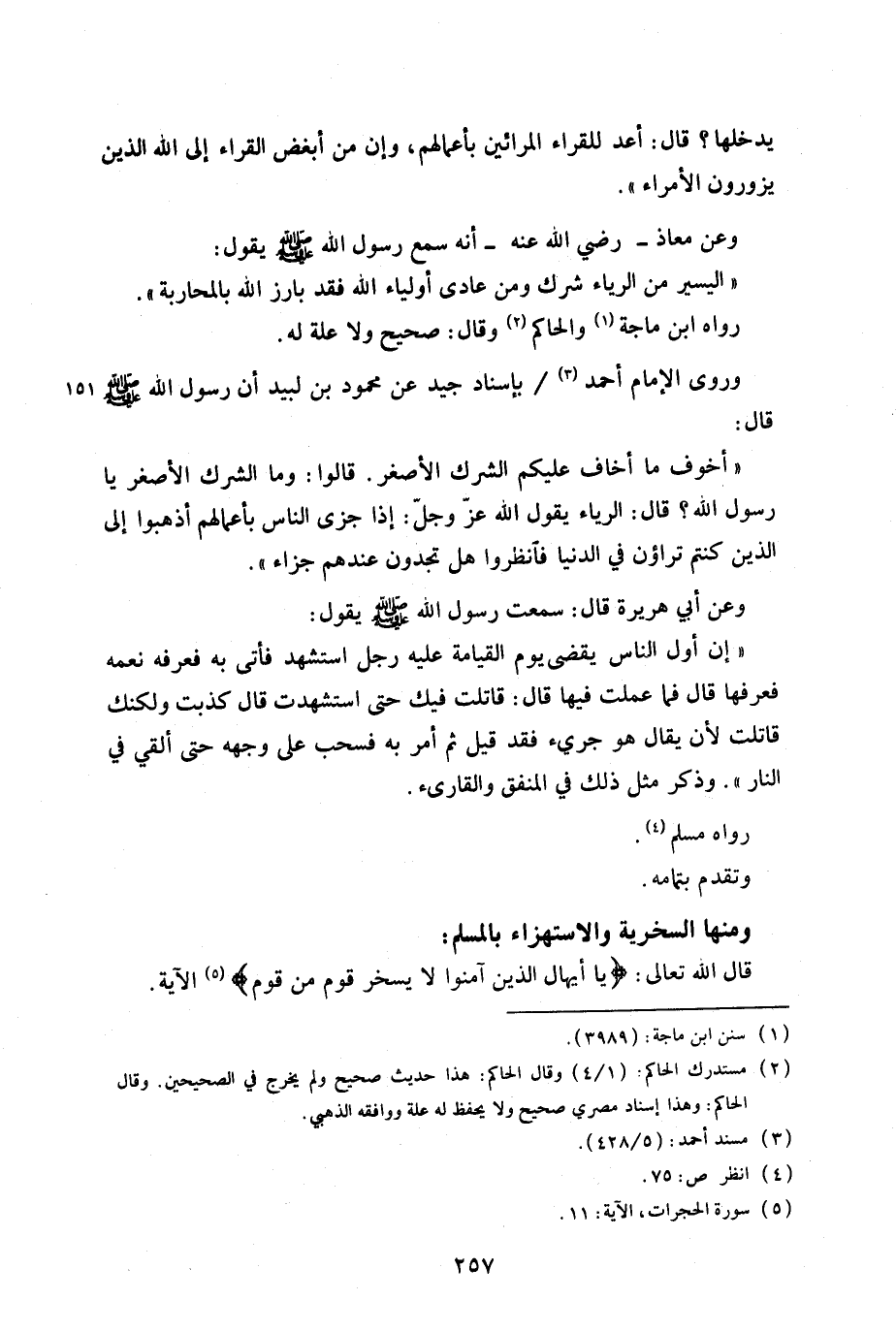 وعن معاذ – رضي الله عنه – أنه سمع رسول الله صلى الله عليه وسلم يقول: «اليسير من الرياء شرك ومن عادى أولياء الله فقد بارز الله بالمحاربة». رواه ابن ماجة والحاكم وقال: صحيح ولا علة له.