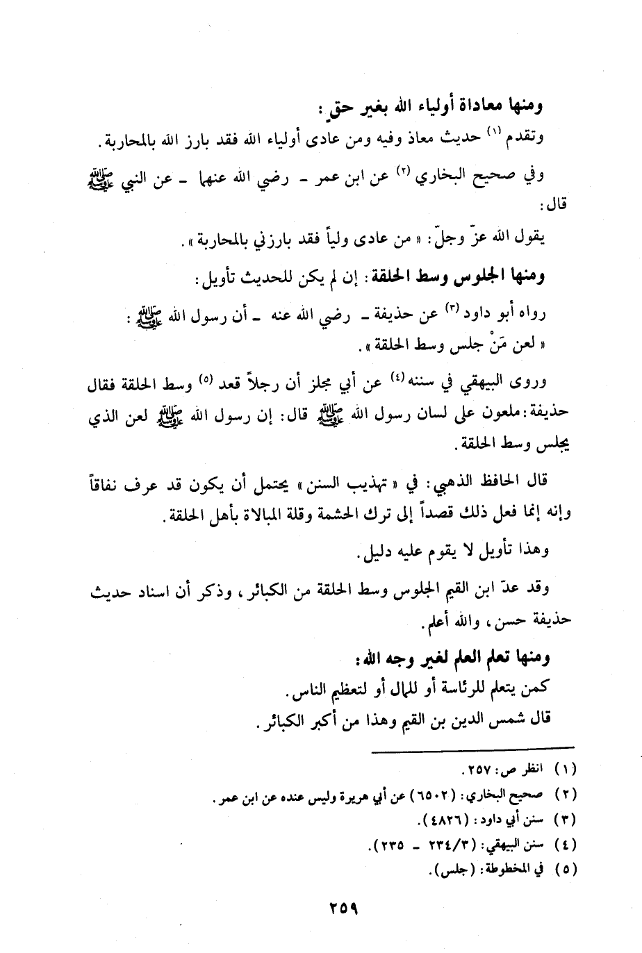 ومنها الجلوس وسط الحلقة: إن لم يكن للحديث تأويل: رواه أبو داود عن حذيفة – رضي الله عنه – أن رسول الله صلى الله عليه وسلم قال: «لعن من جلس وسط الحلقة».