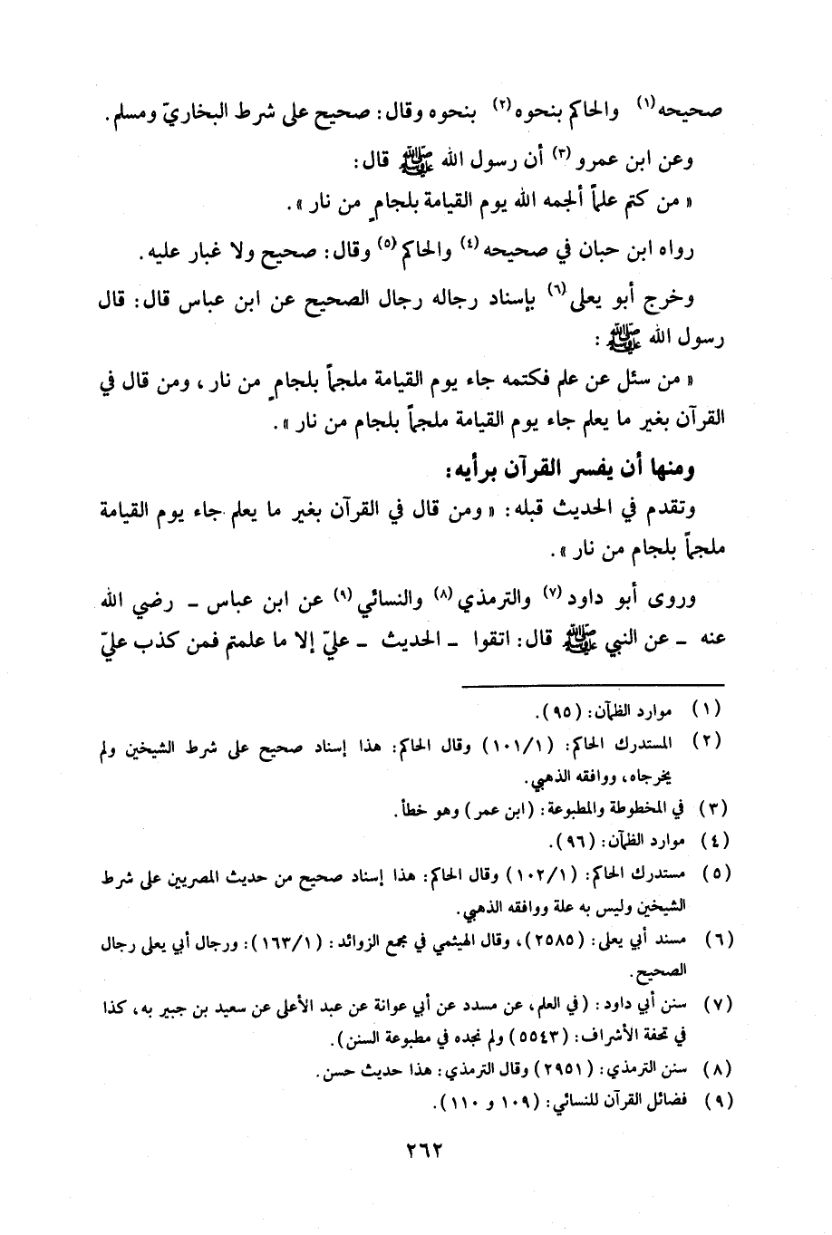 «من سئل عن علم فكتمه جاء يوم القيامة ملجماً بلجام من نار، ومن قال في القرآن بغير ما يعلم جاء يوم القيامة ملجماً بلجام من نار».