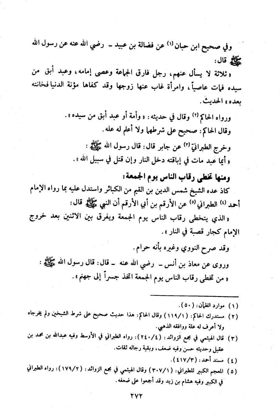 «الذي يتخطى رقاب الناس يوم الجمعة ويفرق بين الاثنين بعد خروج الإمام كجار قصبة في النار».