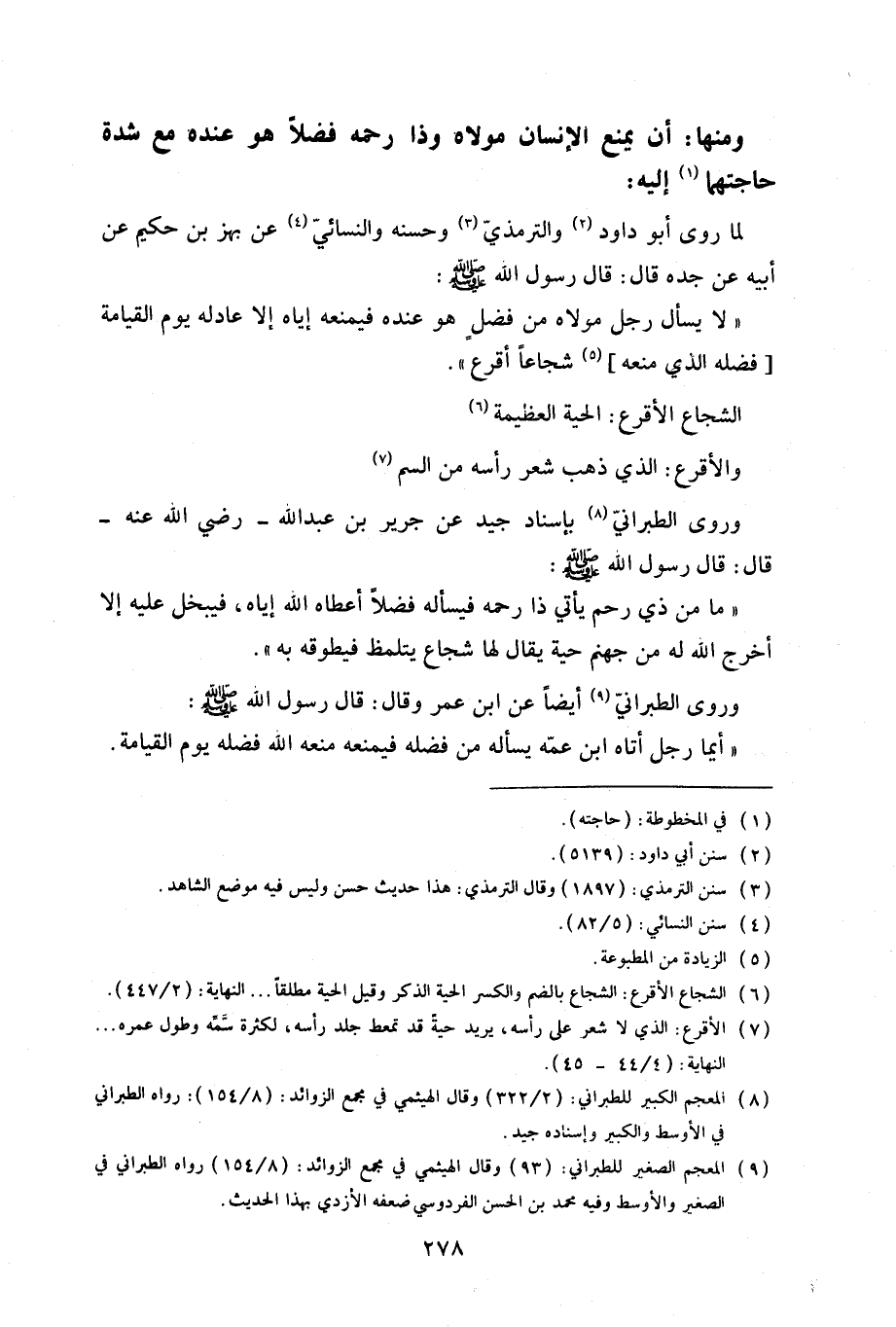 «ما من ذي رحم يأتي ذا رحمه فيسأله فضلاً أعطاه الله إياه، فيبخل عليه إلا أخرج الله له من جهنم حية يقال لها شجاع يتلمظ فيطوقعه به».