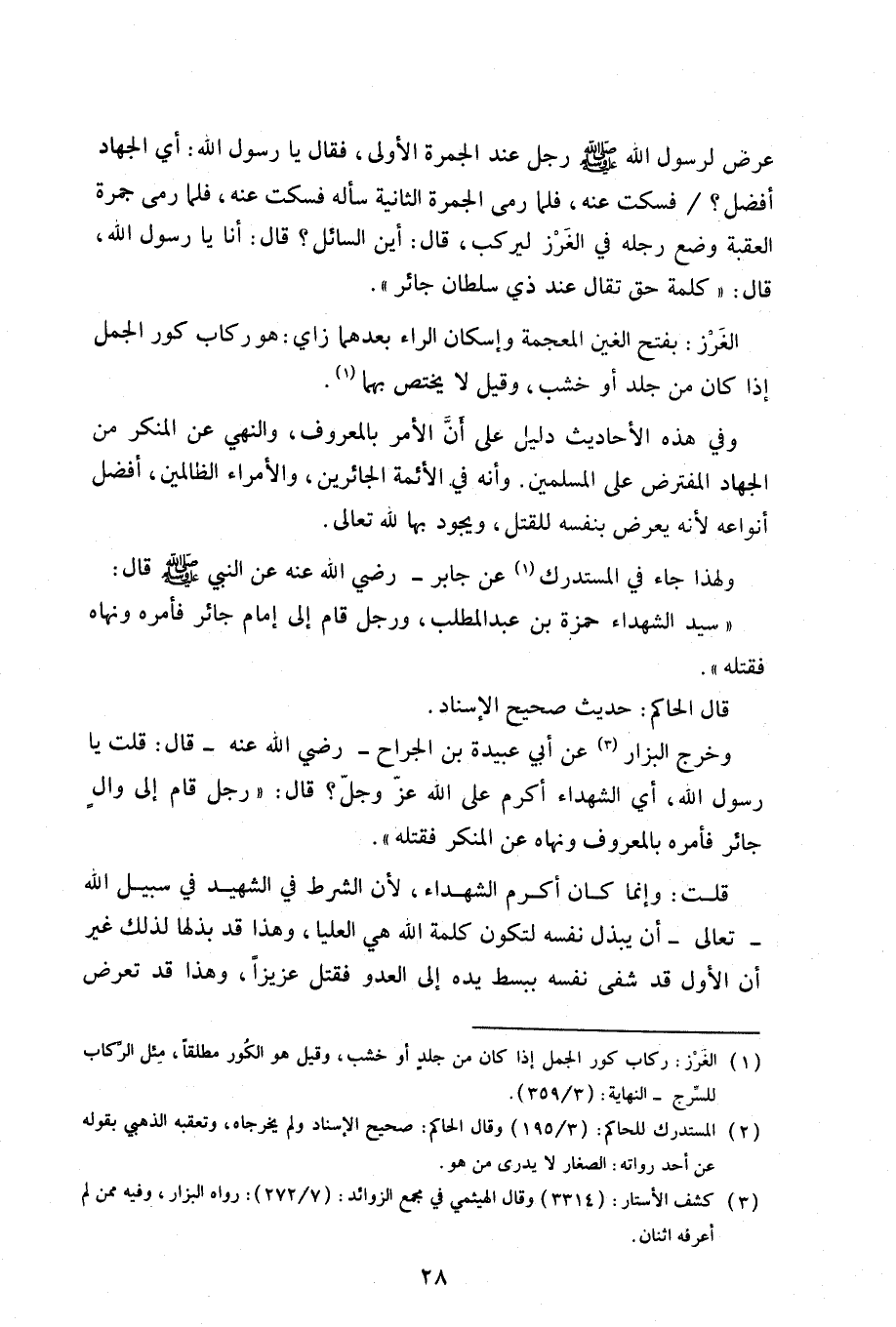 وخرج البزار عن أبي عبيدة بن الجراح – رضي الله عنه – قال: قلت يا رسول الله، أي الشهداء أكرم على الله عز وجل؟ قال: «رجل قام إلى وال جائر فأمره بالمعروف ونهاه عن المنكر فقتله».
