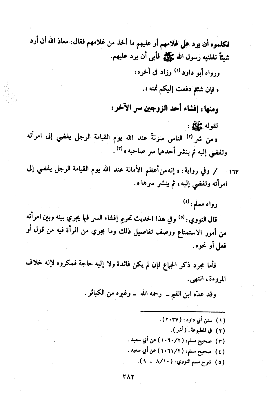 قال النووي: وفي هذا الحديث تحريم إفشاء السر فيما يجري بينه وبين امرأته من أمور الاستمتاع ووصف تفاصيل ذلك وما يجري من المرأة فيه من قول أو فعل أو نحوه.