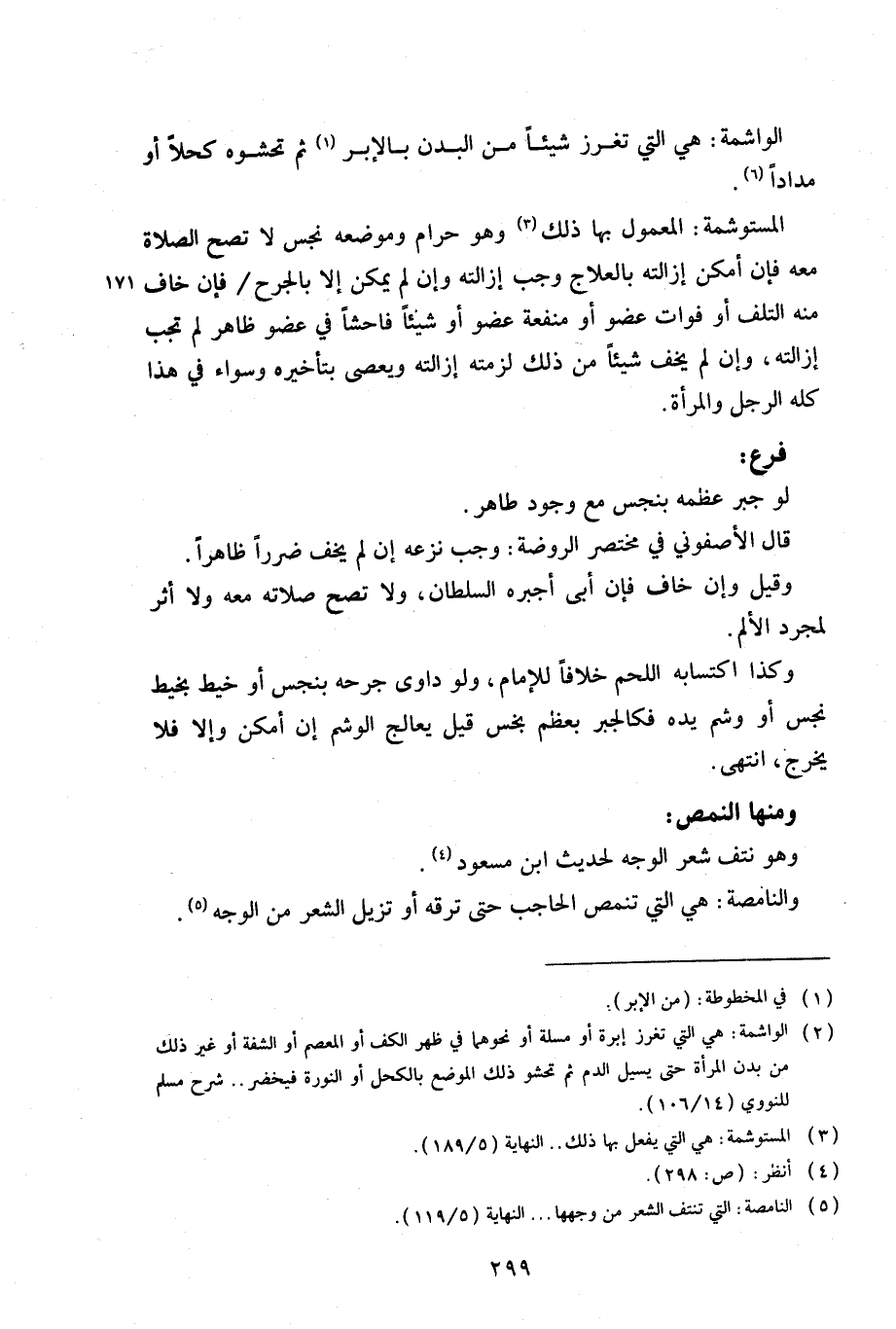 المستوشمة: المعمول بها ذلك وهو حرام وموضعه نجس لا تصح الصلاة معه فإن أمكن إزالته بالعلاج وجب إزالته وإن لم يمكن إلا بالجرح/ فإن خاف 171 منه التلف أي فوات عضو أو منفعة عضو أو شيئاً فاحشا في عضو ظاهر لم تجب إزالته، وإن لم يخف شيئاً من ذلك لزمته إزالته ويعصى بتأخيره وسواء في هذا كله الرجل والمرأة.