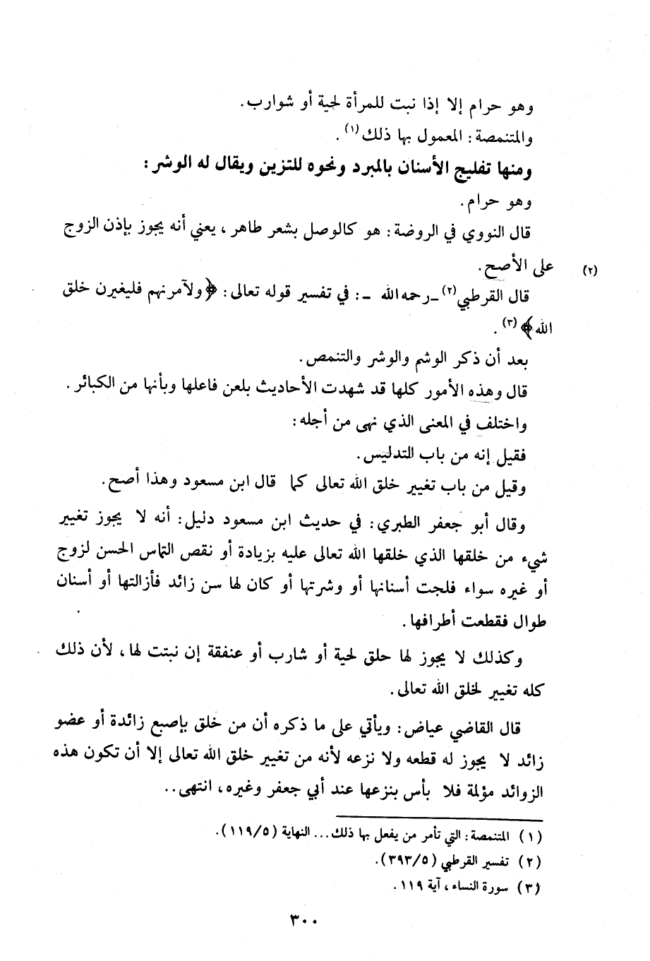 وقال أبو جعفر الطبري: في حديث ابن مسعود دليل: أنه لا يجوز تغيير شيء من خلقها الذي خلقها الله تعالى عليه بزيادة أو نقص التماس الحسن لزوج أو غيره سواء فلجت أسنانها أو وشرتها أو كان لها من زائد فأزالتها أو أسنان طوال فقطعت أطرافها.