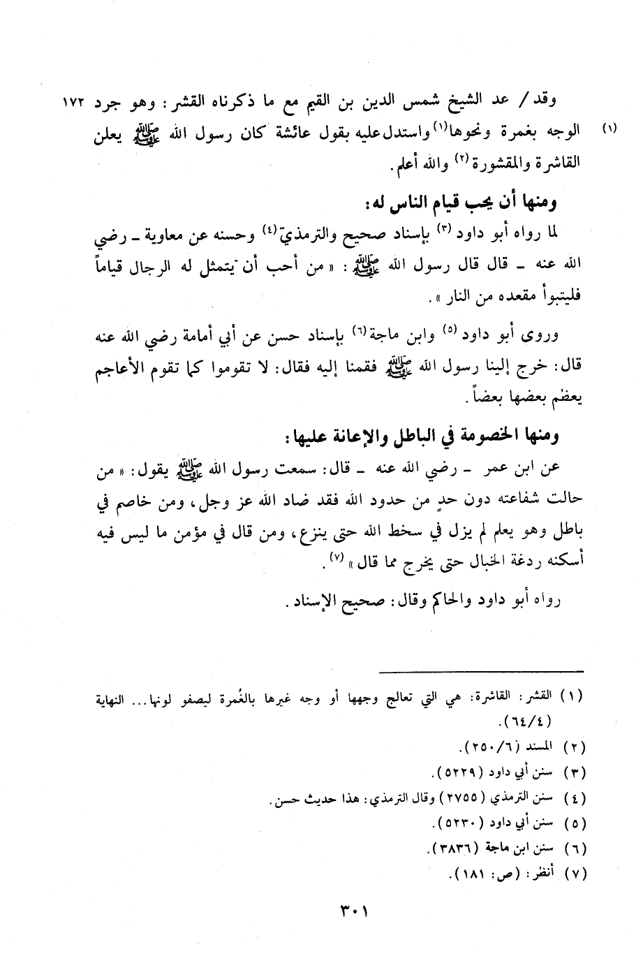 وقد/ عد الشيخ شمس الدين بن القيم مع ما ذكرناه القشر: وهو جرد 172 الوجه بغمرة ونحوها واستدل عليه بقول عائشة كان رسول الله صلي الله عليه وسلم يعلن القاشرة والمقشورة والله أعلم.