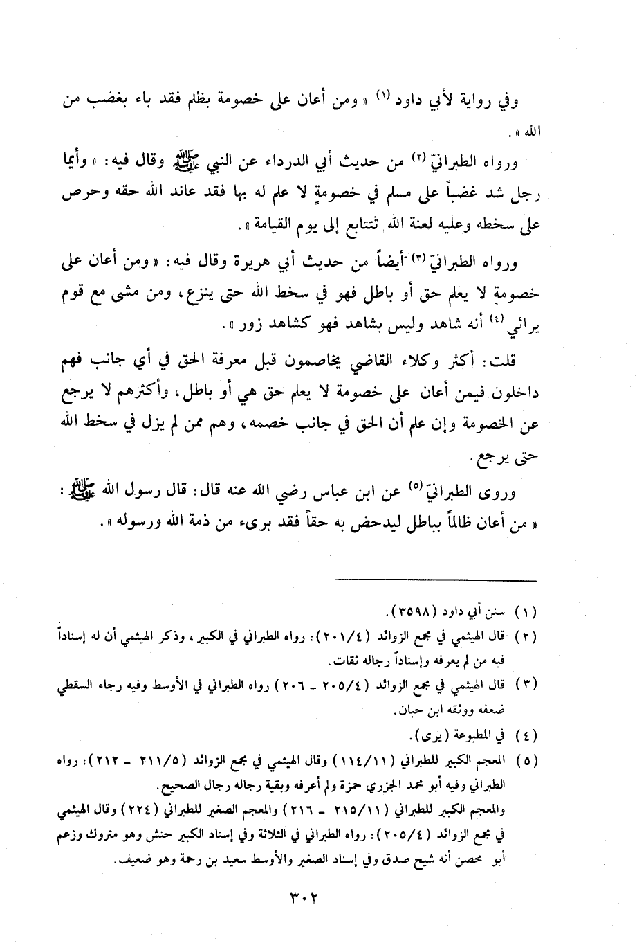 ورواه الطبراني أيضاً من حديث أبي هريرة وقال فيه: «ومن أعان على خصومة لا يعلم حق أو باطل فهو في سخط الله حق ينزع، ومن مشى مع قوم يرائي أنه شاهد وليس بشاهد فهو كشاهد زور».
