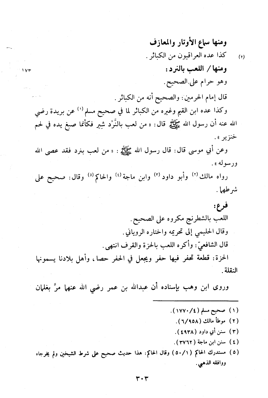 وكذا عده ابن القيم وغيره من الكبائر لما في صحيح مسلم عن بريدة رضي الله عنه أن رسول الله صلي الله عليه وسلم قال: «من لعب بالنرد شير فكأنما صبغ يده في لحم خنزير»
