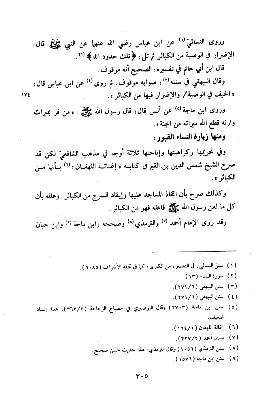 وكذلك صرح بأن اتخاذ المساجد عليها وإيقاد السرج من الكبائر. وعلله بأن كل ما لعن رسول الله صلي الله عليه وسلم فاعله فهو من الكبائر.