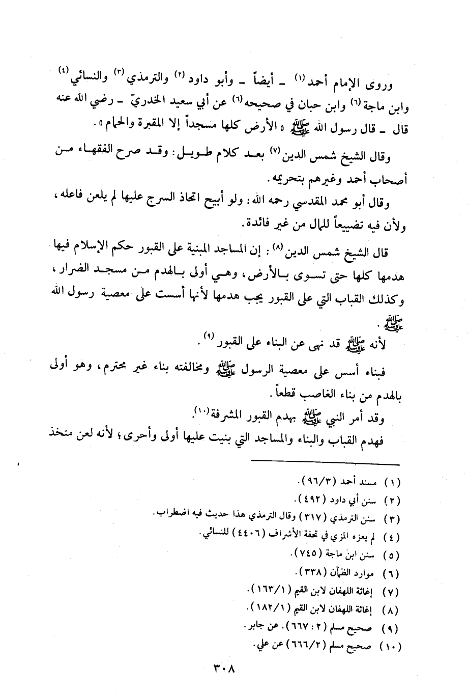 وقال الشيخ شمس الدين: إن المساجد المبنية على القبور حكم الإعلام فيها هدمها كلها حتى تسوى بالأرض، وهي أول بالهدم من مسجد الضرار، وكذلك القباب التي على القبور يجب هدمها لأنها أسست على معصية رسول الله صلي الله عليه وسلم.