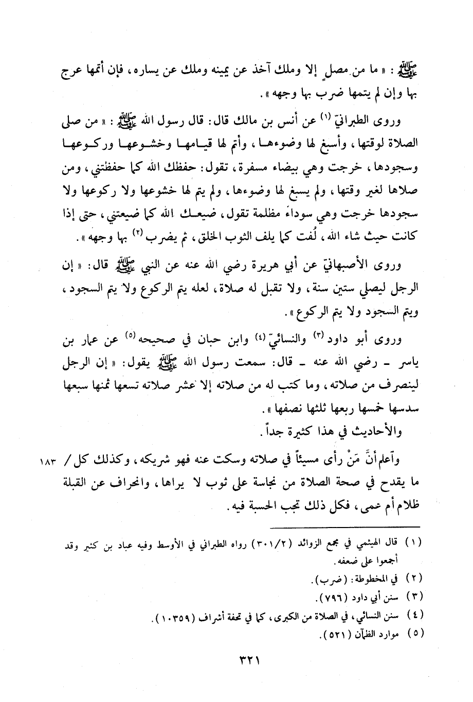 وروى الطبراني عن أنس بن مالك قال: قال رسول الله صلى الله عليه وسلم: "من صلى الصلاة لوقتها، وأصبغ لها وضوءها، وأتم لها قيامها وخشوعها وركوعها وسجودها، خرجت وهي بيضاء مسفرة، تقول: حفظ الله كما حفظتني، ومن صلاها لغيرها وقتها، ولم يسبغ لها وضوءها، ولم يتم لها خشوعها ولا ركوعها ولا سجودها خرجت وهي سوداء مظلمة تقول، ضيعك الله كما ضيعتني، حتى إذا كانت حيث شاء الله، لُفت كما يلف الثوب الخلق، ثم يضرب بها وجهه".