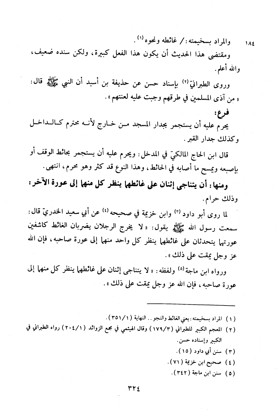 ورواه ابن ماجة ولفظه: "لا يتناجى اثنان على غائطهما ينظر كل منهما إلى عورة صاحبه، فإن الله عز وجل يمقت على ذلك".