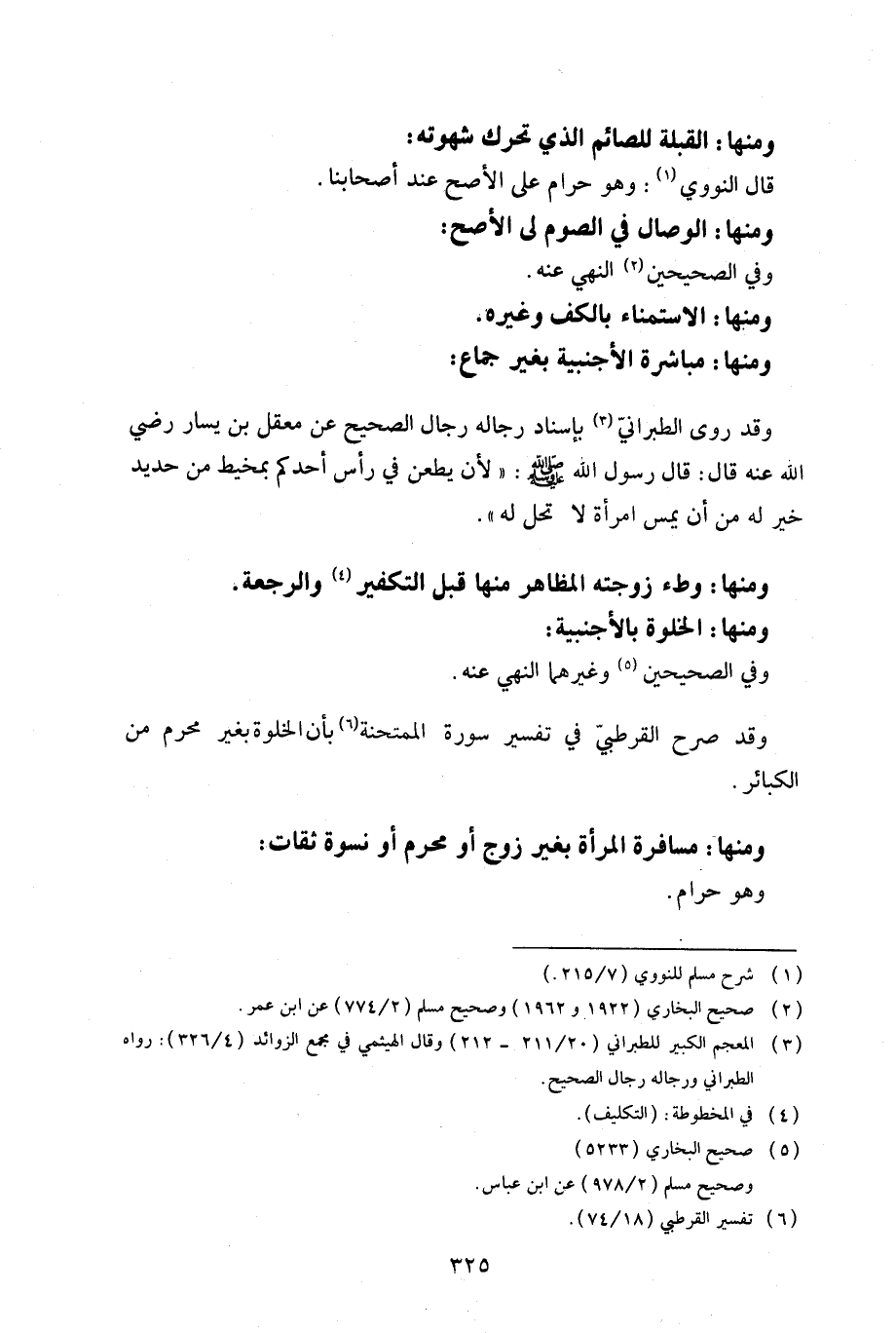 ومنها: مسافرة المرأة بغير زوج أو محرم أو نسوة ثقات: