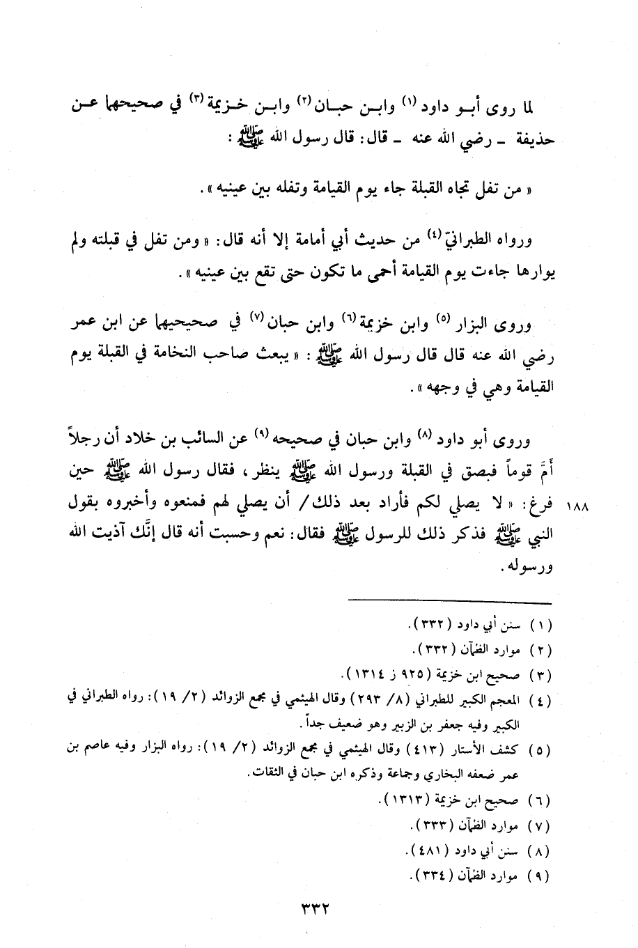 "من تفل تجاه القبلة جاء يوم القيامة وتفله بين عينيه".