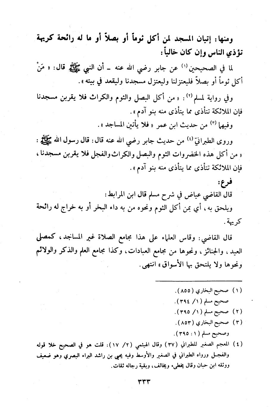وروى الطبراني من حديث جابر رضي الله عنه قال: قال رسول الله صلى الله عليه وسلم: "من أكل هذه الخضروات الثوم والبصل والكراث والفجل فلا يقربن مسجدنا، فإن الملائكة تتأذى مما يتأذى منه بنو آدم".