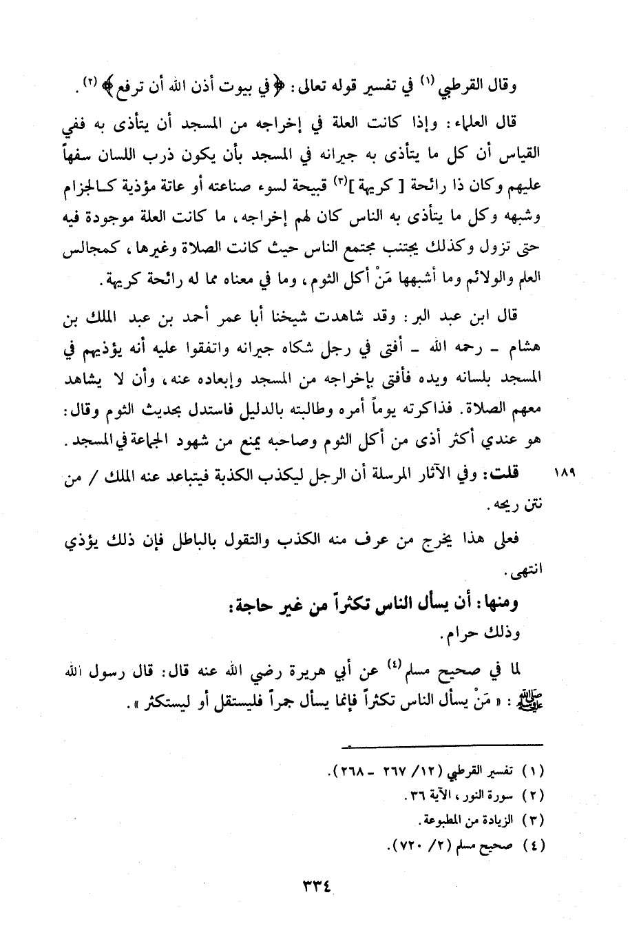 قال ابن عبد البر: وقد شاهدت شيخنا أبا عمر أحمد بن عبد الملك بن هشام – رحمه الله – أفتى في رجل شكاه جيرانه واتفقوا عليه أنه يؤذيهم في المسجد بلسانه ويده فأفتى بإخراجه من المسجد وإبعاده عنه، وأن لا يشاهد معهم الصلاة. فذاكرته يوماً أمره وطالبته بالدليل فاستدل بحديث الثوم وقال: هو عندي أكثر أذى من أكل الثوم وصاحبه يمنع من شهود الجماعة في المسجد.