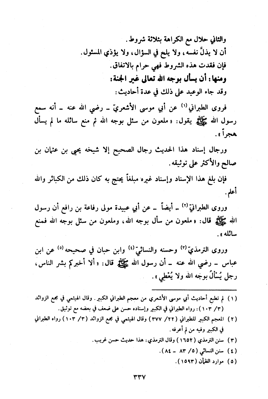 وروى الطبراني – أيضًا – عن أبي عبيدة مولى رفاعة بن رافع أن رسول الله صلى الله عليه وسلم قال: «ملعون من سأل بوجه الله، وملعون من سئل بوجه الله فمنع سائله».