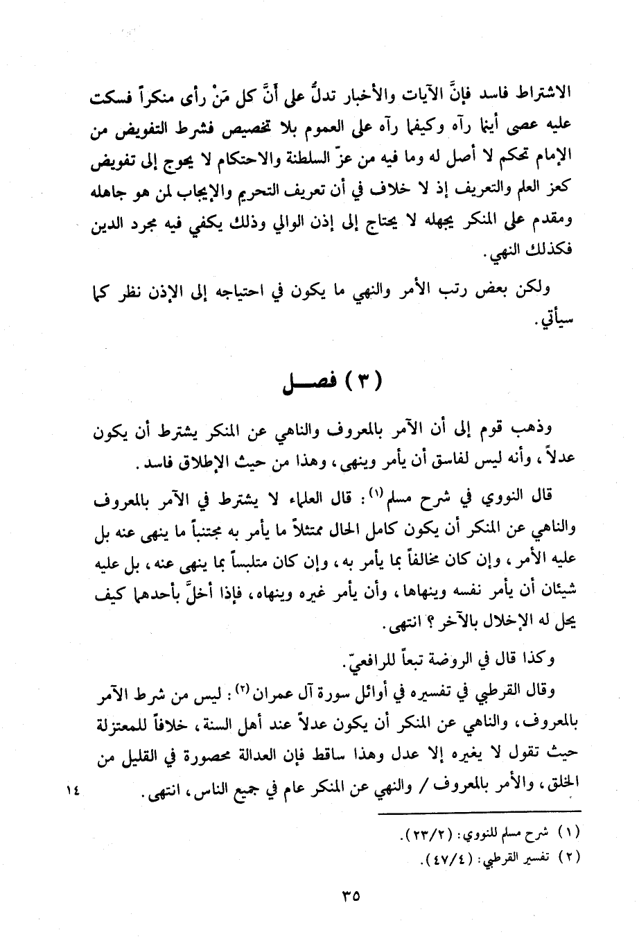 وقال القرطبي في تفسيره في أوائل سورة آل عمران: ليس من شرط الآمر بالمعروف، والناهي عن المنكر أن يكون عدلاً عند أهل السنة، خلافاً للمعتزلة حيث تقول لا يغيره إلا عدل وهذا ساقط فإن العدالة محصورة في القليل من الخلق، والأمر بالمعروف / والنهي عن المنكر عام في جميع الناس، انتهى.