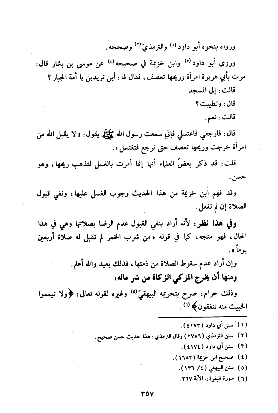 وروى أبو داود وابن خزيمة في صحيحه عن موسى بن بشار قال: مرت بأبي هريرة امرأة وريحها تعصف، فقال لها: أين تريدين يا أمة الجبار؟