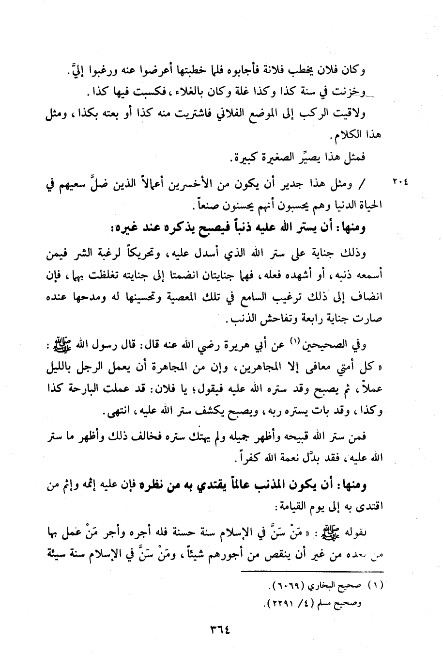وفي الصحيحين عن أبي هريرة رضي الله عنه قال: قال رسول الله صلى الله عليه وسلم: «كل أمتي معافى إلا المجاهرين، وإن من المجاهرة أن يعمل الرجل بالليل عملاً، ثم يصبح وقد ستره الله عليه فيقول؛ يا فلان: قد عملت البارحة كذا وكذا، وقد بات يستره ربه، ويصبح يكشف ستر الله عليه»، انتهى.