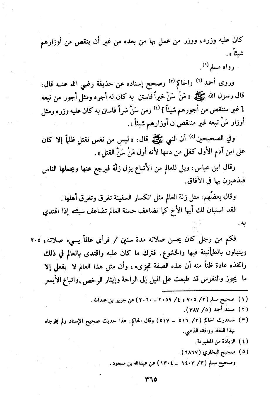 وروى أحمد والحاكم وصحح إسناده عن حذيفة رضي الله عنه قال: قال رسول الله صلى الله عليه وسلم «من سن خيرًا فاستن به كان له أجره ومثل أجور من تبعه [غير منتقص من أجورهم شيئًا] ومن سن شرًا فاستن به كان عليه وزره ومثل أوزار من تبعه غير منتقص من أوزارهم شيئًا».