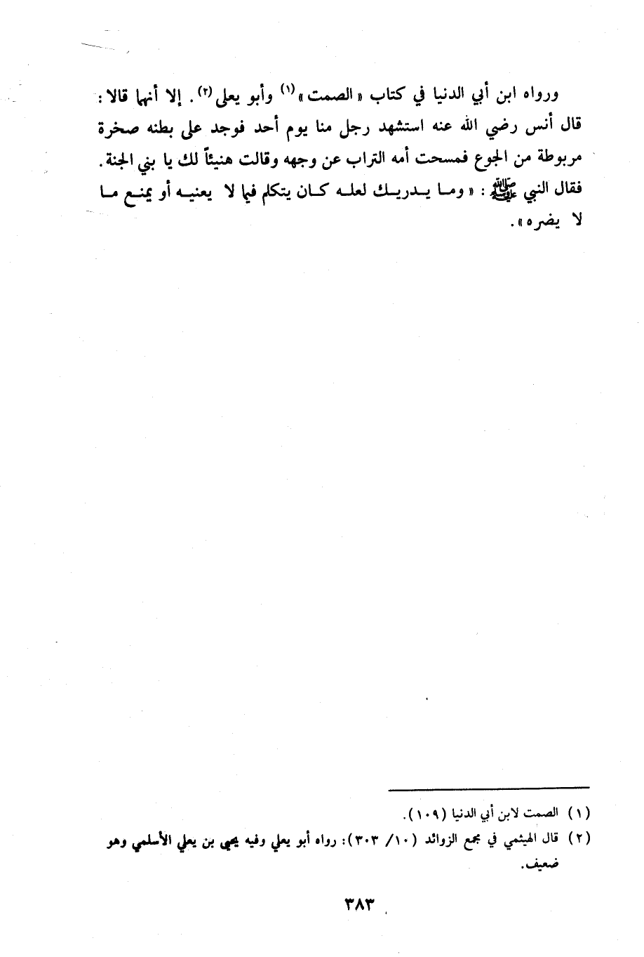 ورواه ابن أبي الدنيا في كتاب (الصمت) وأبو يعلى. إلا أنهما قالا: قال أنس رضي الله عنه استشهد رجل منا يوم أحد فوجد على بطنه صخرة مربوطة من الجوع فمسحت أمه التراب عن وجهه وقالت هنيئًا لك يا بني الجنة. فقال النبي صلى الله عليه وسلم: «وما يدريك لعله كان يتكلم فيما لا يعنيه أو يمنع ما لا يضره».