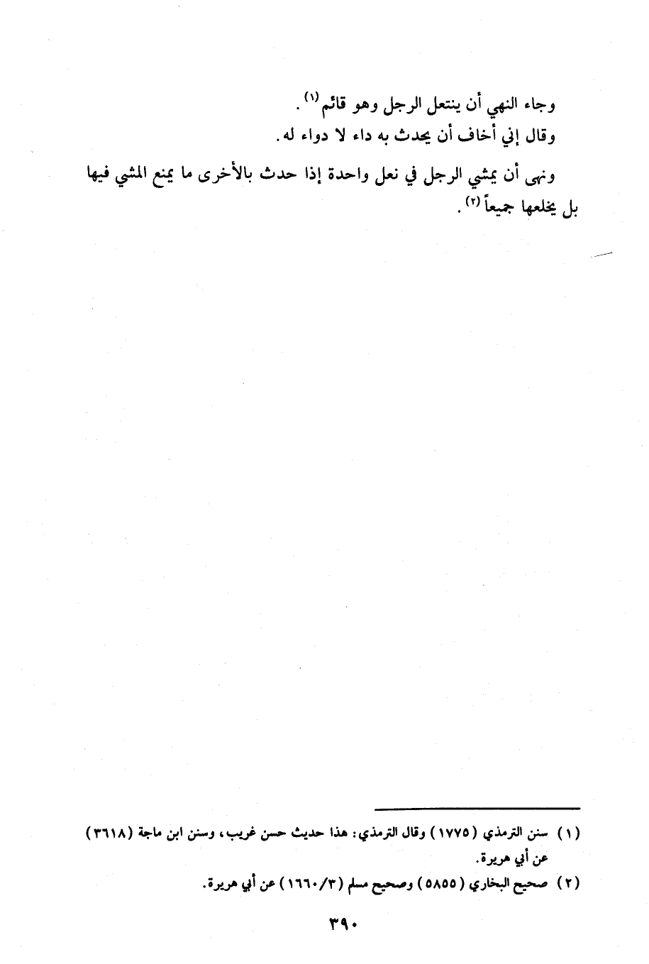 ونهى أن يمشي الرجل في نعل واحدة إذا حدث بالأخرى ما يمنع المشي فيها بل يخلعها جميعًا.