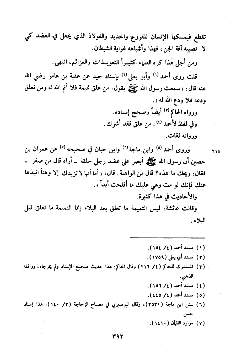قلت روى أحمد وأبو يعلى بإسناد جيد عن عقبة بن عامر رضي الله عنه قال: «سمعت رسول الله صلى الله عليه وسلم يقول: من علق تميمة فلا أتم الله له ومن تعلق ودعة فلا ودع الله له».