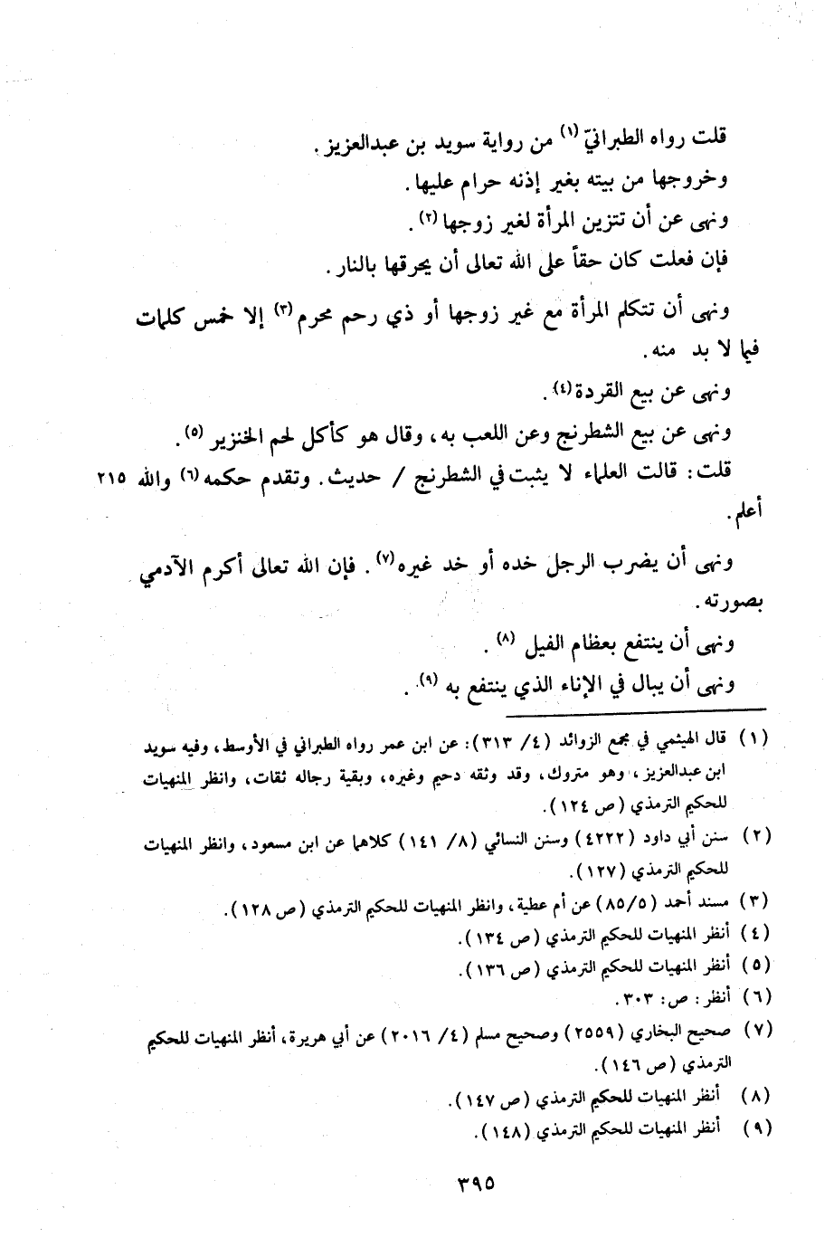 ونهى أن تتكلم المرأة مع غير زوجها أو ذي رحم محرم إلا خمس كلمات فيما لابد منه.