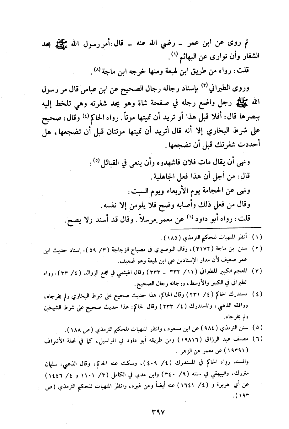 ثم روي عن ابن عمر – رضي الله عنه – قال: أمر رسول الله صلى الله عليه وسلم بحد الشفار وأن توارى عن البهائم.