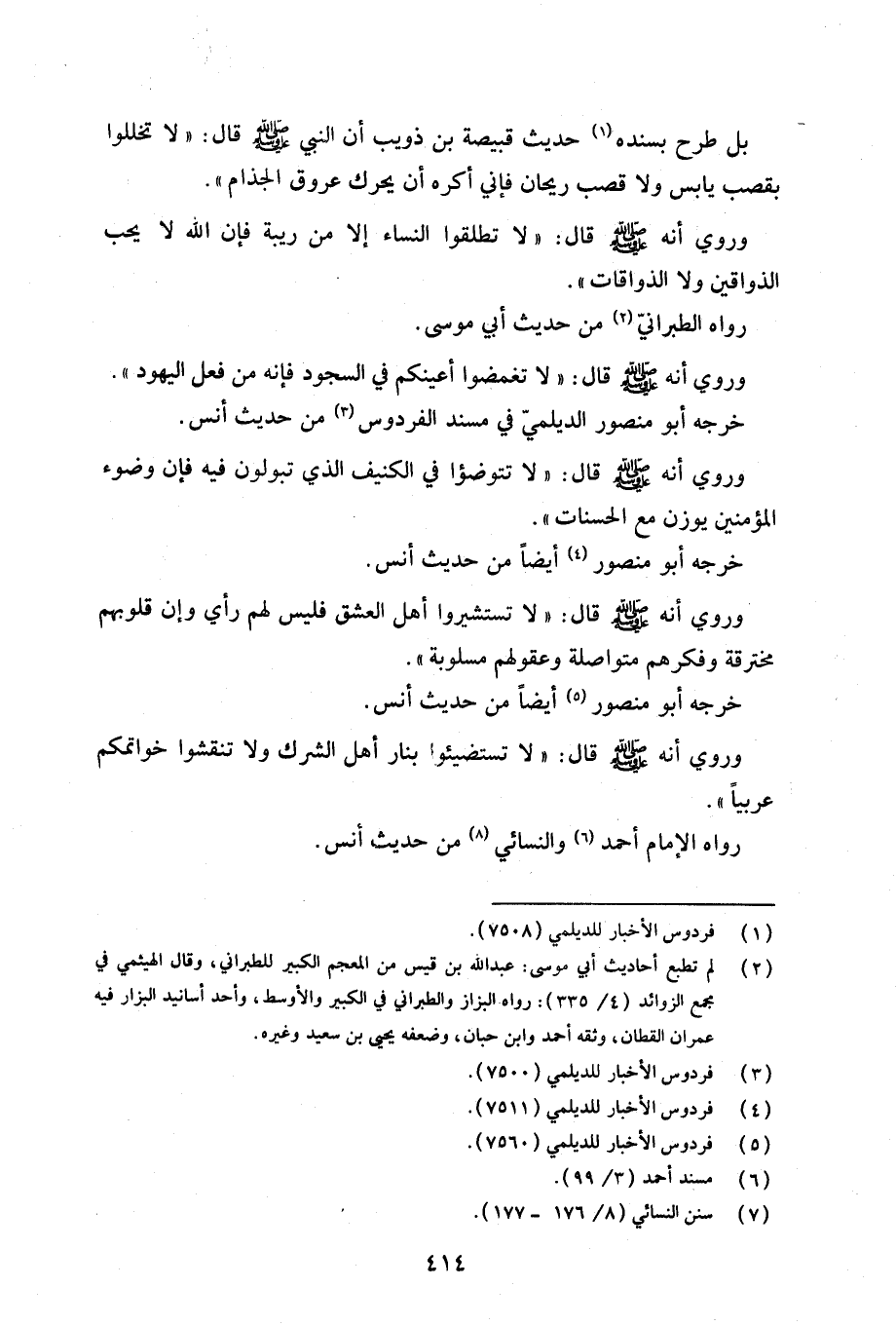 بل طرح بسنده حديث قبيصة بن ذويب أن النبي صلى الله عليه وسلم قال: «لا تخللوا بقصب يابس ولا قصب ريحان فإني أكره أن يحرك عروق الجذام».