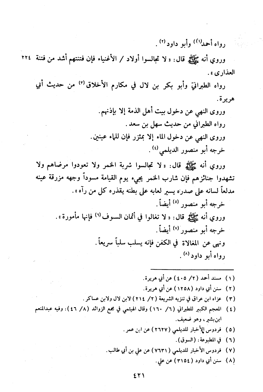 وروي أنه صلى الله عليه وسلم قال: «لا تجالسوا شربة الخمر ولا تعودوا مرضاهم ولا تشهدوا جنائزهم فإن شارب الخمر يجيء يوم القيامة مسودًا وجهه مزرقة عينه مدلعًا لسانه على صدره يسير لعابه على بطنه يقذره كل من رآه».