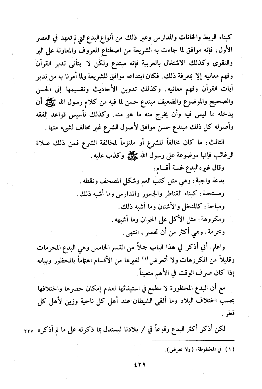 كبناء الربط والخانات والمدارس وغير ذلك من أنواع البدع التي لم تعهد في العصر الأول، فإنه موافق لما جاءت به الشريعة من اصطناع المعروف والمعاونة على البر والتقوى وكذلك الاشتغال بالعربية فإنه مبتدع ولكن لا يتأتى تدبر القرآن وفهم معانيه إلا بمعرفة ذلك. فكان ابتداعه موافق للشريعة ولما أمرنا به من تدبر آيات القرآن وفهم معانيه. وكذلك تدوين الأحاديث وتقسيمها إلى الحسن والصحيح والموضوع والضعيف مبتدع حسن لما فيه من كلام رسول الله صلى الله عليه وسلم أن يدخله ما ليس فيه وأن يخرج منه ما هو منه. وكذلك تأسيس قواعد الفقه وأصوله كل ذلك مبتدع حسن موافق لأصول الشرع غير مخالف لشيء منها.