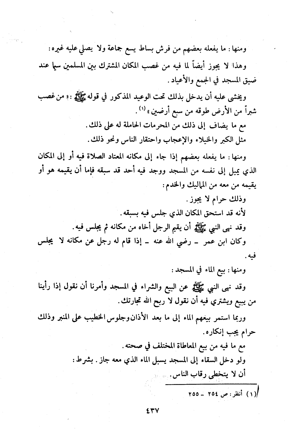 ومنها: ما يفعله بعضهم من فرش بساط يسع جماعة ولا يصلي عليه غيره: وهذا لا يجوز أيضًا لما فيه من غضب المكان المشترك بين المسلمين سيما عند ضيق المسجد في الجمع والأعياد.